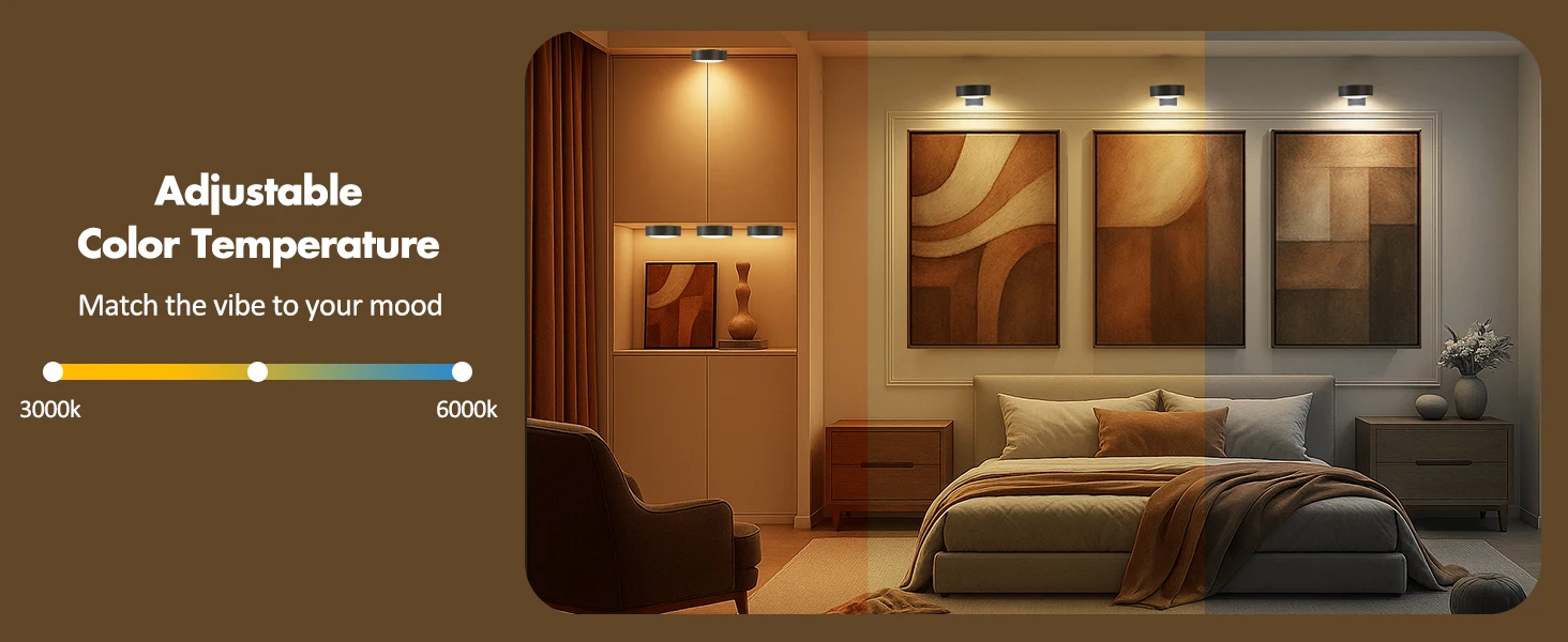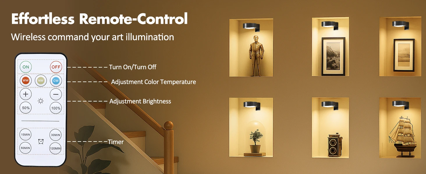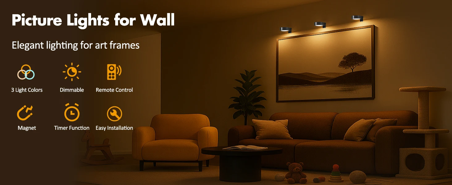 3 lighting modes(warm white/ natural white/ cool white). Dimmable: 10-100% brightness adjustment. Timing Functions: Set the picture light to turn off automatically after 15, 30, 60, 120 minutes. Lights can be set by remote control or manual touch